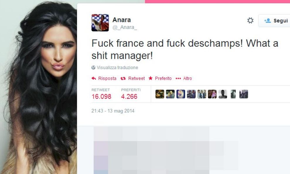 Siamo sicuri che profonda è la delusione di Nasri che sta per vincere, a meno di cataclismi, la Premier League con il suo City. Nessuna parola però. Ci pensa la sua fidanzata Anara a scatenare un polverone con un tweet polemico nel quale usa parole molto pesanti nei confronti di Deschamps, insulti, epiteti. Non serve proprio la traduzione…